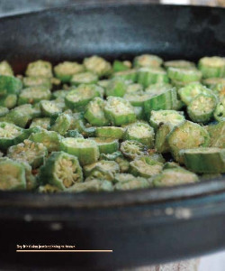 Although a little clarified butter or oil is used to wet the pan, this method is called “dry-fried okra” to emphasize that the dish differs dramatically from stewed and deep-fried versions. If you’ve always disliked okra in its gooey state (in stews and gumbos), you might like this crispy presentation. Okra is an easy vegetable to grow in the South and has lovely flowers. Our local farmer George Simpson usually has a plentiful supply, so we often get our okra from him and save potager space for growing other herbs and vegetables.