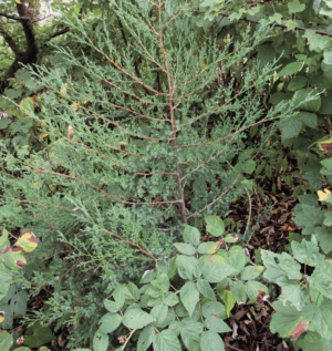 This volunteer cedar tree chose to grow nestled between red currants and raspberries in the shade of an apricot tree.