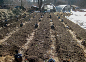 Beds laid out for low tunnel assembly. Bags first, then hoops, then covers. This picture dates from our tillage days. Straight raised beds with exposed soil surface, mulched wheel tracks to keep weeds out and prevent bags and covers from freezing to the ground. The field does not look like this anymore.