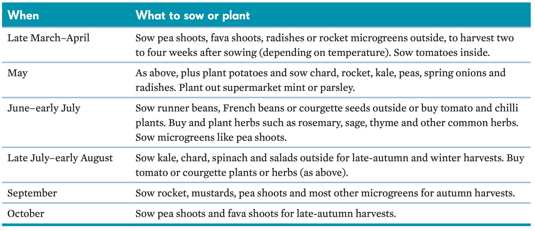 - Sow outside in late March: Rocket, mustards, radishes, spring onions and coriander.