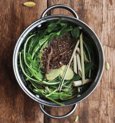 1. Bring the water to a boil and add the fresh greens and dried roots.