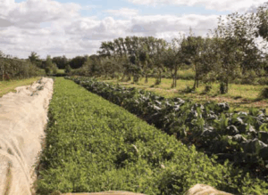 A standard single apple row with managed grass understorey at Close Farm. On the left, fleece covers one of the mixed vegetable beds. Photo courtesy of Ben Raskin.