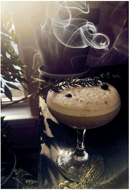 Brew some Earl Grey tea and allow it to cool. Put 6 ounces of the tea in a shaker tin with the Lavender Sage Honey Tea Syrup, oat milk, lemon juice, egg white, juniper hydrosol, rhodiola tincture, and cinnamon. Shake first without ice, then with ice. Strain into a coupe.