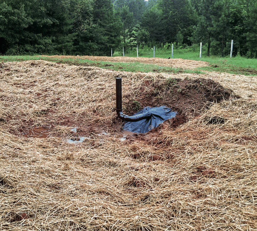 A black pipe boot surrounds the drainpipe of this newly constructed, unfilled pond. The remainder of the pond liner is covered with soil, which has been topped with straw to prevent erosion. The upright portion of the pipe is an adjustable riser that can be positioned either higher or lower than the level of the pond’s secondary overflow.