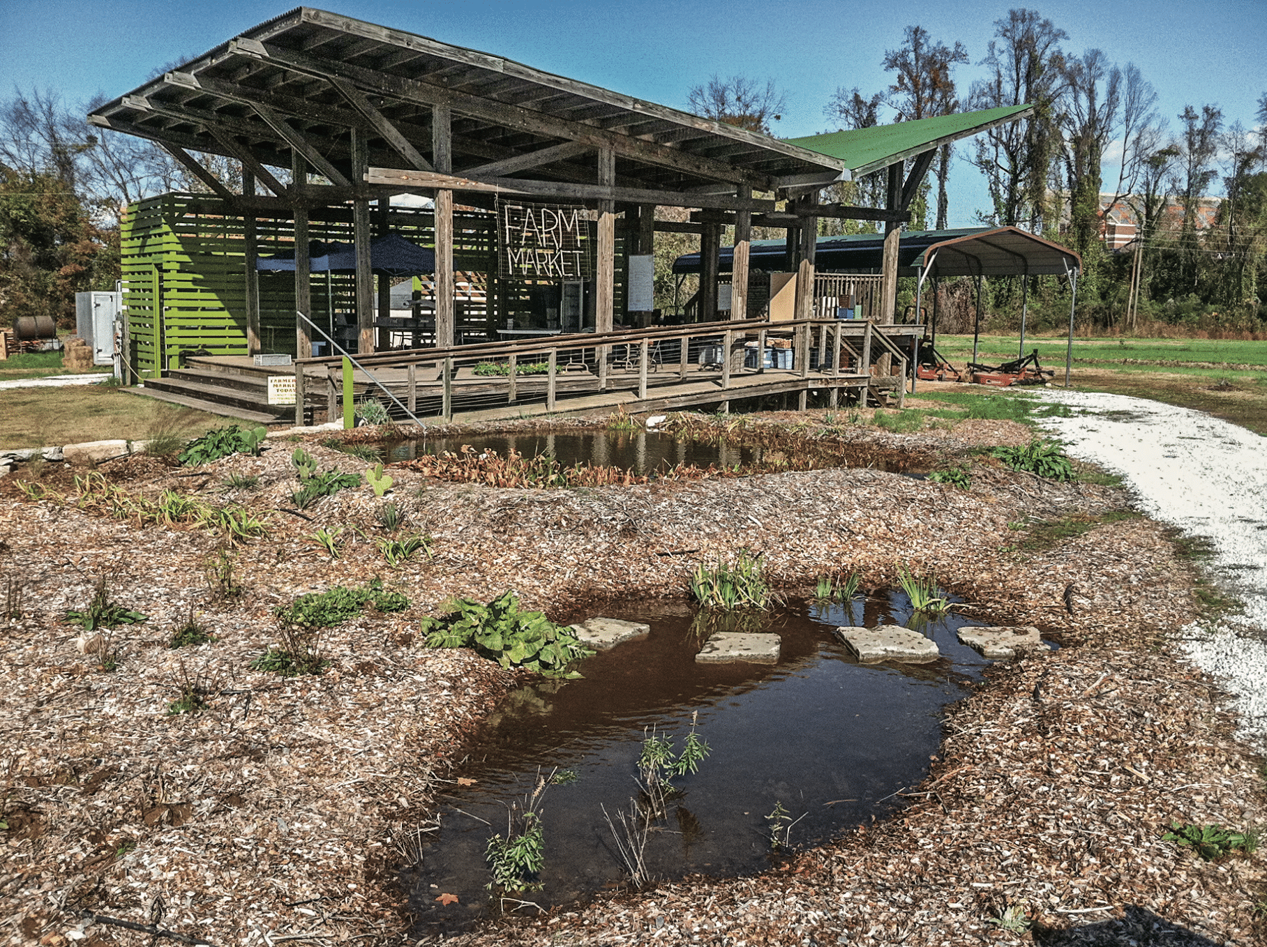 The retention basin in the foreground accepts overflow from the larger turkey nest pond at the Clemson University outdoor farm market. We think about sustainability for small details, too: the stepping-stones in the retention basin are made from recycled concrete!