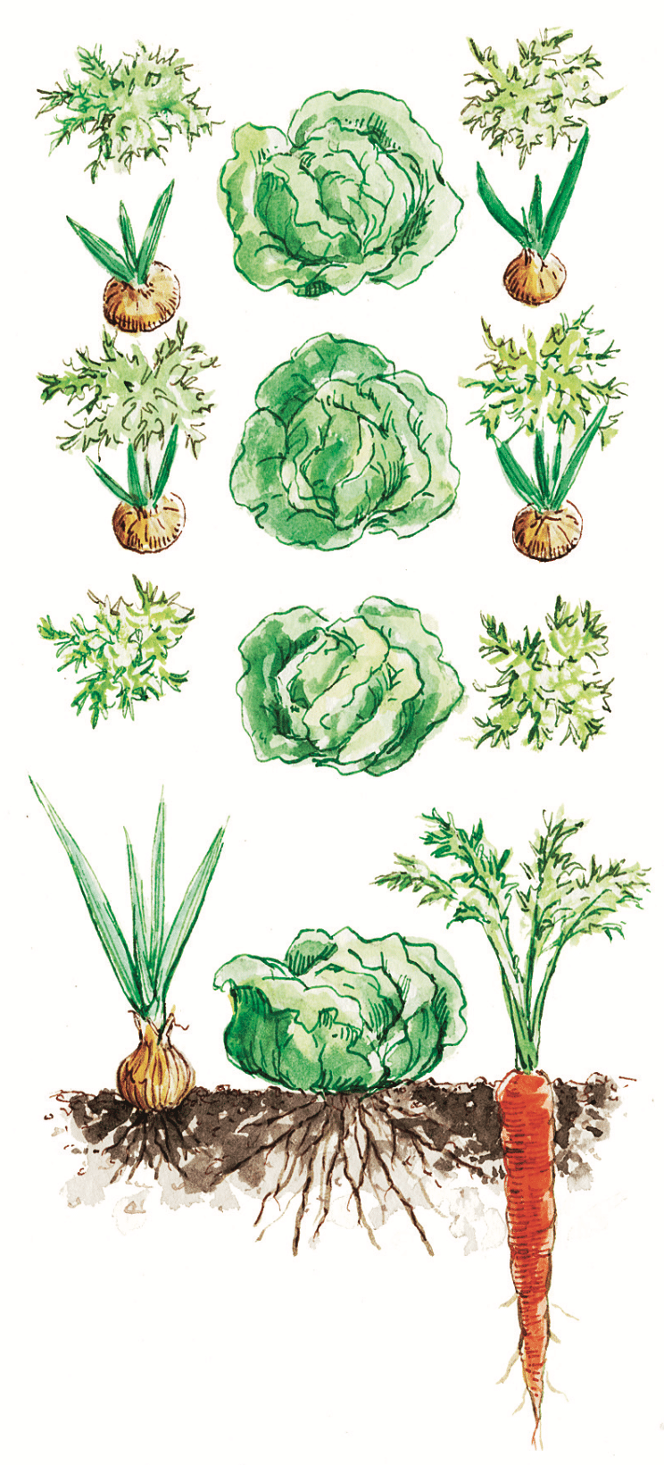 An interplant of lettuce, onions, and carrots, which allows dense planting while avoiding competition for nutrients and sunlight. Illustration by Elayne Sears.